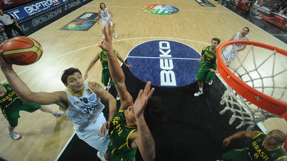 El primer gran cruce fue ante Brasil, dirigido por el cordobés Rubén Magnano. En un juego de ajedrez táctico, en donde Argentina decidió liberar a Marcelo Huertas para proteger el juego interior, fue clave el papel defensivo de Oberto (se había perdido cuatro partidos por un virus intestinal) ante Anderson Varejao, y en ataque Scola dio un recital ante toda la defensa brasileña.