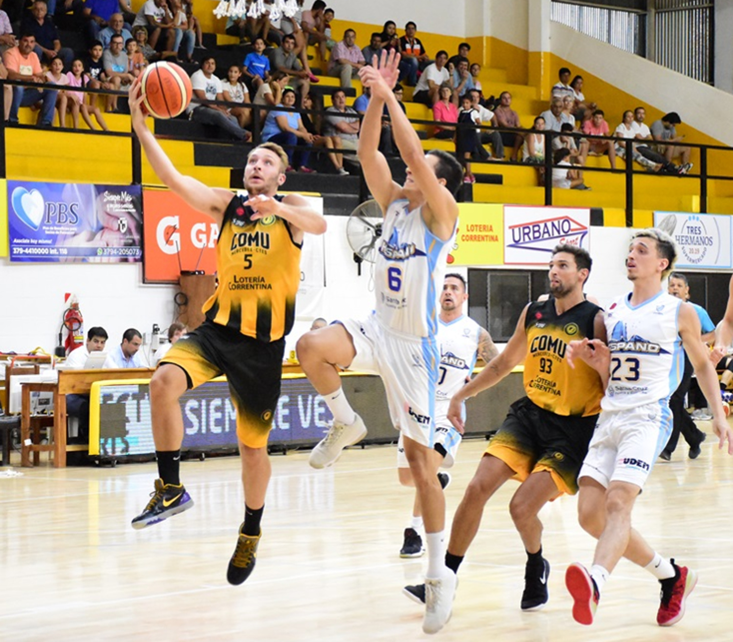 Un lindo primer tiempo protagonizaron Comu e Hispano. El inicio del partido fue parejo pero cuando promediaba el parcial con el aporte de Aprea que vino desde el banco la visita sacó cinco de diferencia. Comu no encontraba el tiro externo, salvo los dos triples de Gerlero el resto fue afuera. Por eso Rearte mandó a la cancha a Bortolín que tuvo un buen pasaje en la pintura para que el local pasara al frente y cerrara el parcial 18 a 17.