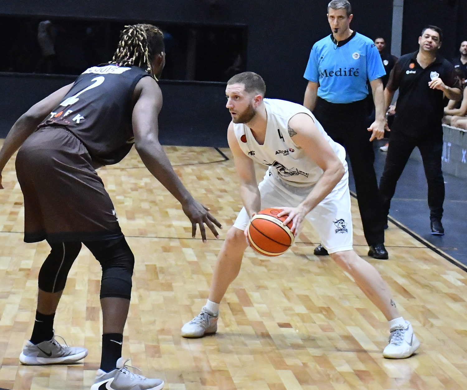 Los primeros 4 minutos del partido los comandó Gimnasia por 5-12 con goleo de sus internos y algunas penetraciones. Para el resto del cuarto Platense corrigió algunos errores de defensa, con su característica zona 3-2, y el extranjero Arnold Louis potenció el ataque con 10 puntos para dar vuelta el resultado. El primer parcial finalizó 21-20.