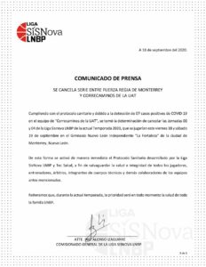 Por esta situación, la LNBP comunicó la cancelación de los partidos que ese equipo tenía que jugar frente a Fuerza Regia en Monterrey esta noche de viernes y el sábado. Además, la Liga informó que rápidamente se implementó el protocolo sanitarios que estaba planeado para estas situaciones.