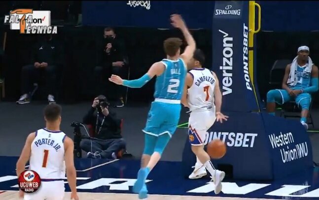 Robo, salida veloz y amague aguantando hasta el último segundo para que LaMelo pase de largo como autobomba yendo al incendio.