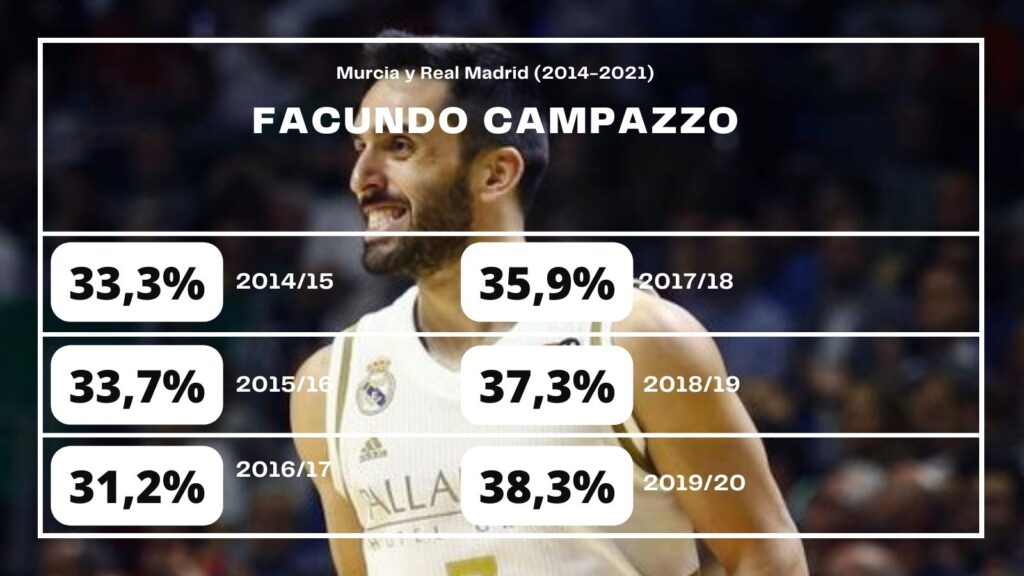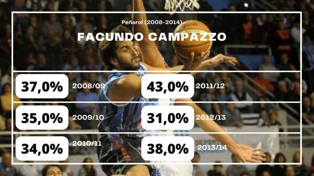 La irregularidad en ese aspecto siempre estuvo, desde sus inicios hasta la actualidad, mejore o no con el tiempo. Eso se vio en la campaña 2012/13, la anteúltima antes de irse al Viejo Continente. Del 43,0% al 31,0%… Como una criptomoneda, subió y bajó con celeridad. Al no ser un tirador natural, es algo normal, sobre todo en edades jóvenes. Y Campazzo tenía 22 años al terminar ese periplo.