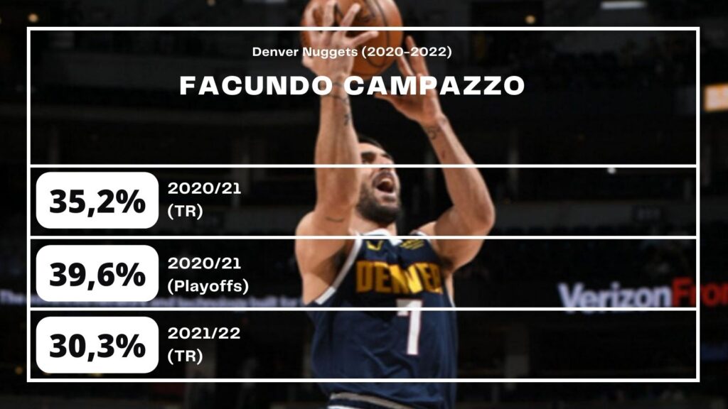 Lamentablemente, esto viene ocurriendo con Facundo Campazzo en Denver Nuggets. Luego de una temporada de adaptación en la 2020/21, lo lógico hubiera sido que el argentino eleve sus porcentajes de tres puntos, su media anotadora y la facilidad para convertir por sí mismo, junto con sus atributos de siempre (las asistencias y la defensa).