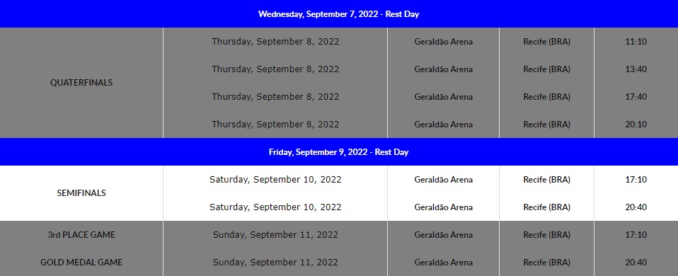 En los Cuartos de Final, que se llevarán a cabo el 8 de septiembre, se mantendrán los mismos horarios (11:10, 13:40, 17:40 y 20:10), mientras que en las Semifinales (10 de septiembre), los dos partidos se efectuarán a las 17:10 (hora local) y 20:40. En la última jornada, el día 11, seguirán a las mismas horas para el partido por el tercer lugar (17:10) y Gran Final (20:40).