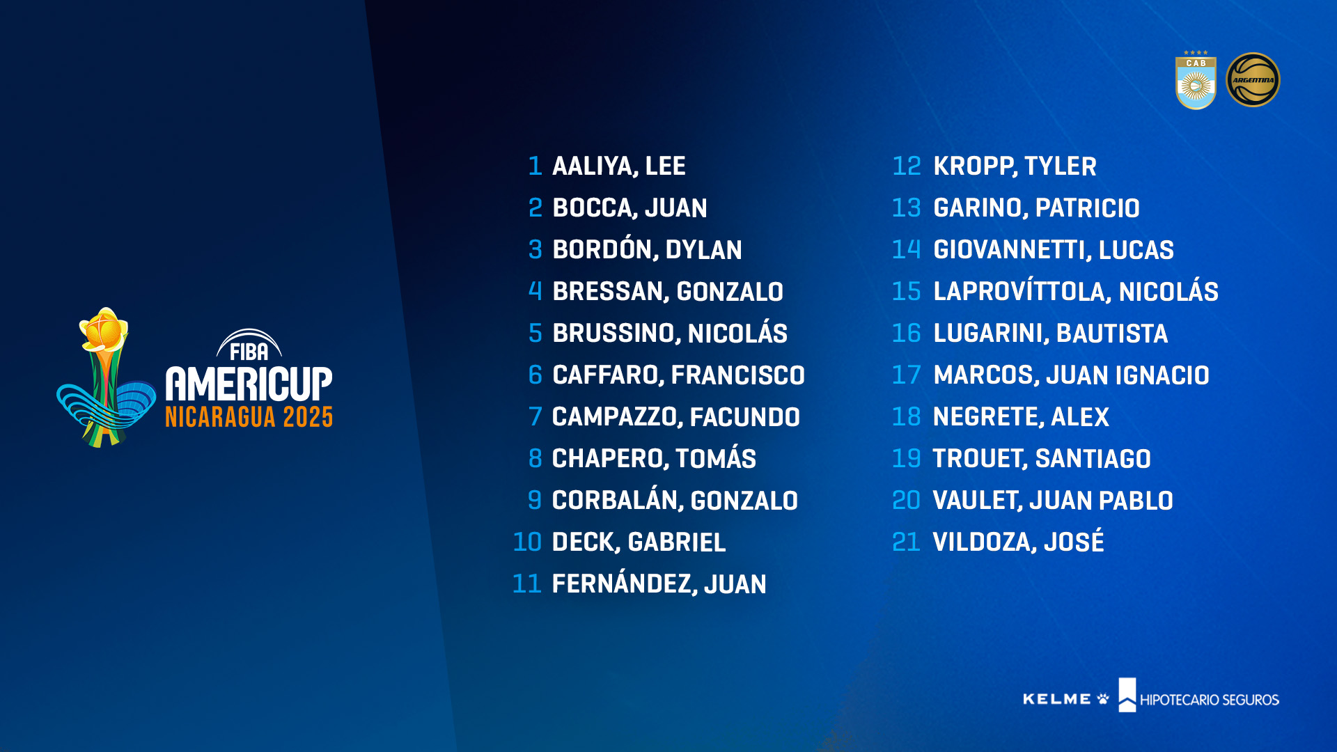 Con el foco puesto en la preparación del Seleccionado mayor masculino para la AmeriCup 2025 de agosto y el comienzo de los Clasificatorios rumbo a la Copa del Mundo FIBA 2027, Pablo Prigioni, Head Coach del equipo nacional, confirmó la lista de 21 jugadores que serán parte de los entrenamientos. La lista combina a los habituales referentes del equipo, junto al grupo de jóvenes que ha sumado muchos minutos en amistosos y partidos oficiales en el último tiempo.