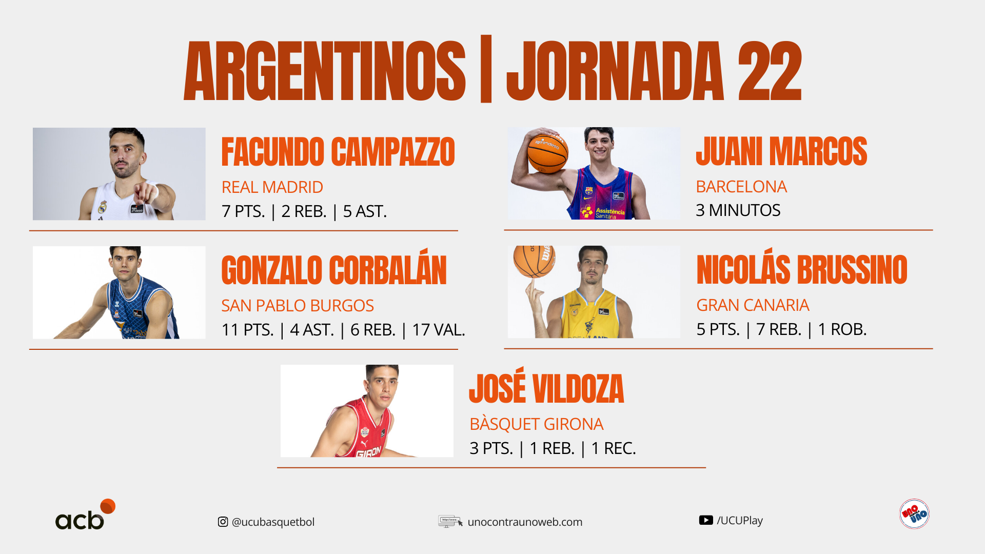 Las lesiones abundan en los representantes argentinos en España. Nicolás Laprovittola, se perderá lo que resta de la temporada por desgarro del tendón del aductor largo del muslo derecho. Maximo Fjellerup se encuentra en la misma situación por una artroscopia en el tobillo derecho, mientras que el interno Juan Fernández sigue de baja por una microrrotura en la fascia del pie izquierdo. Por su parte, Gabriel Deck descansó tras la fecha de Euroleague.