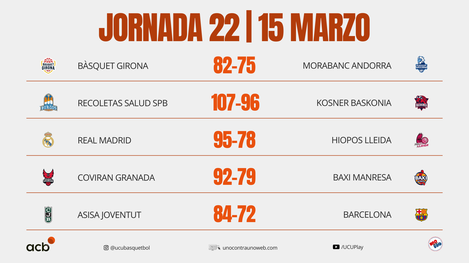 Los resultados de la Liga ACB