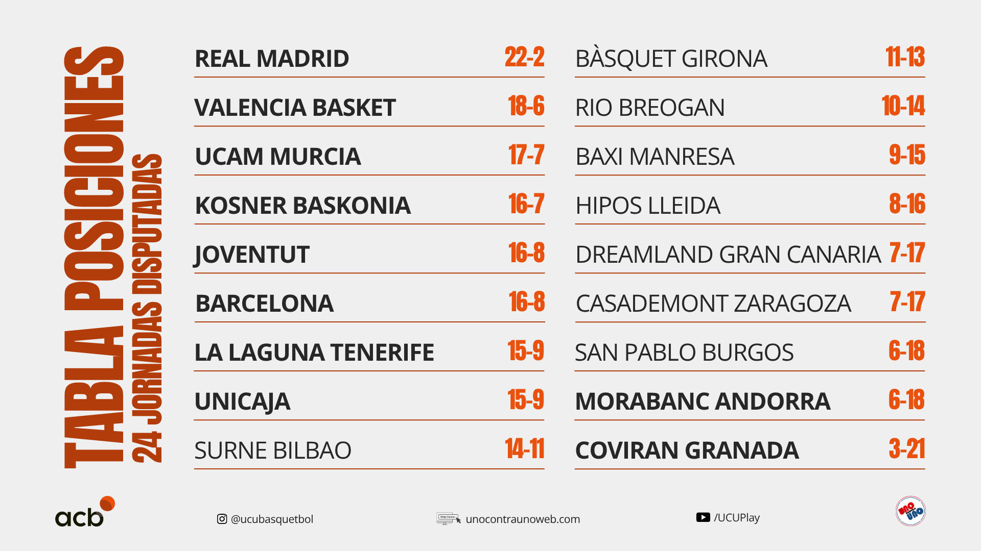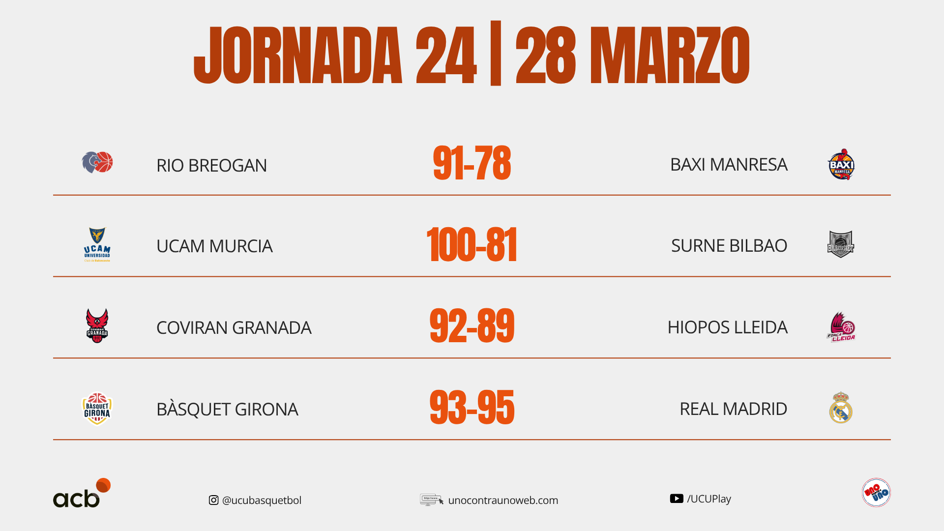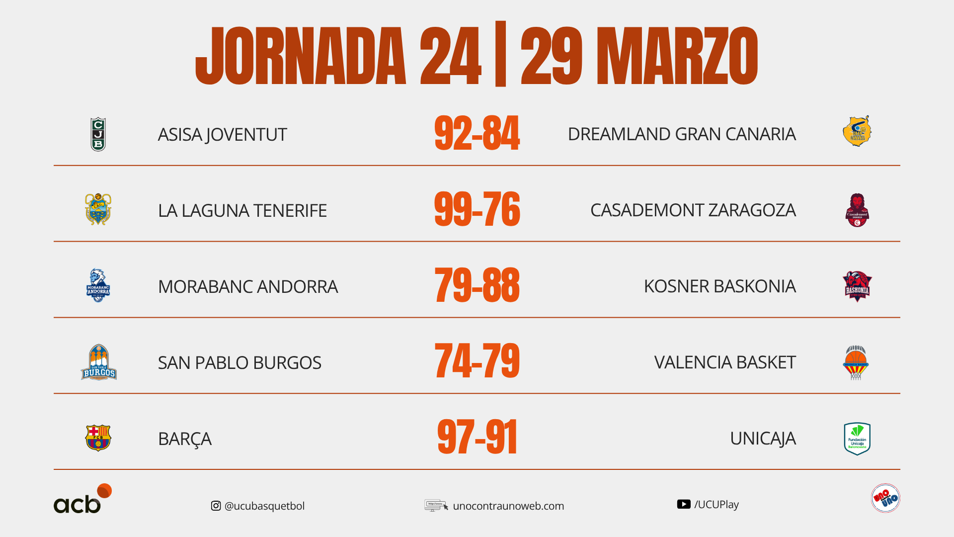 Los resultados de la Liga ACB