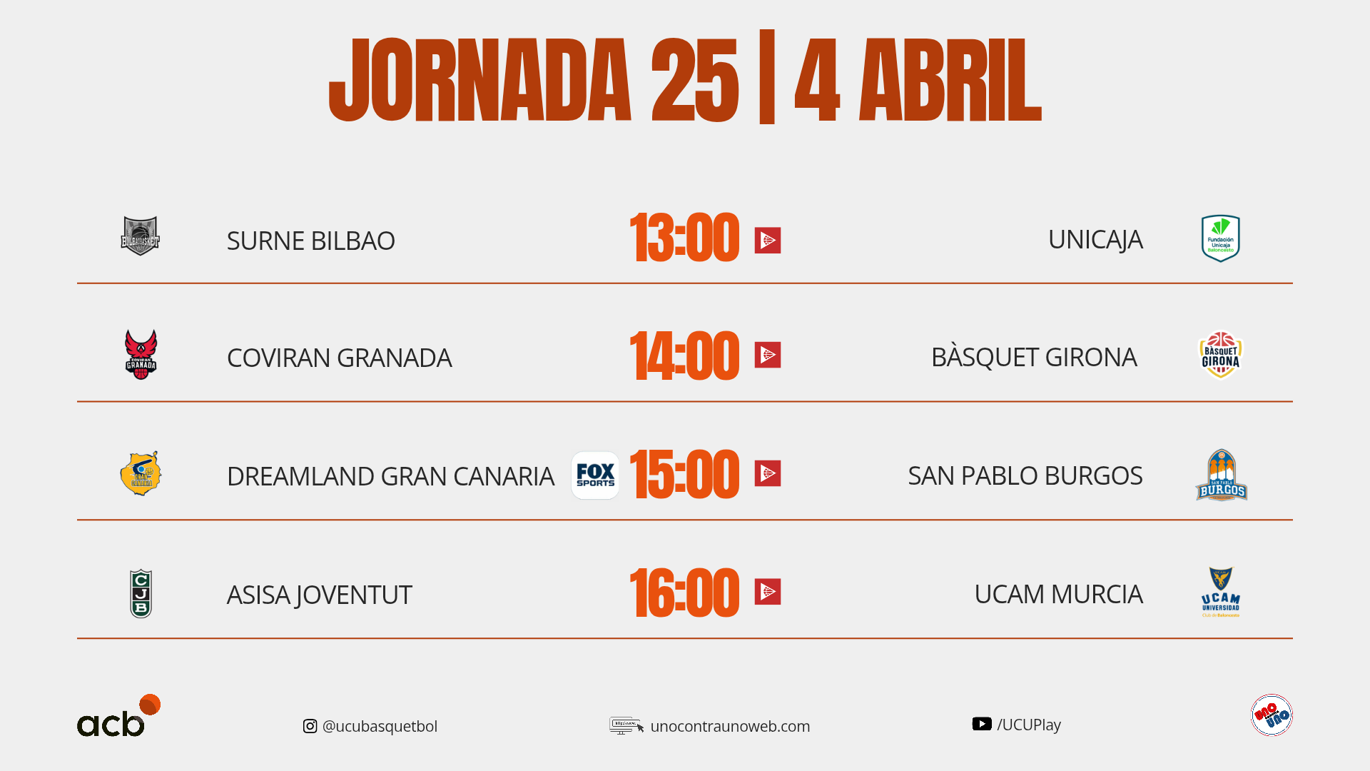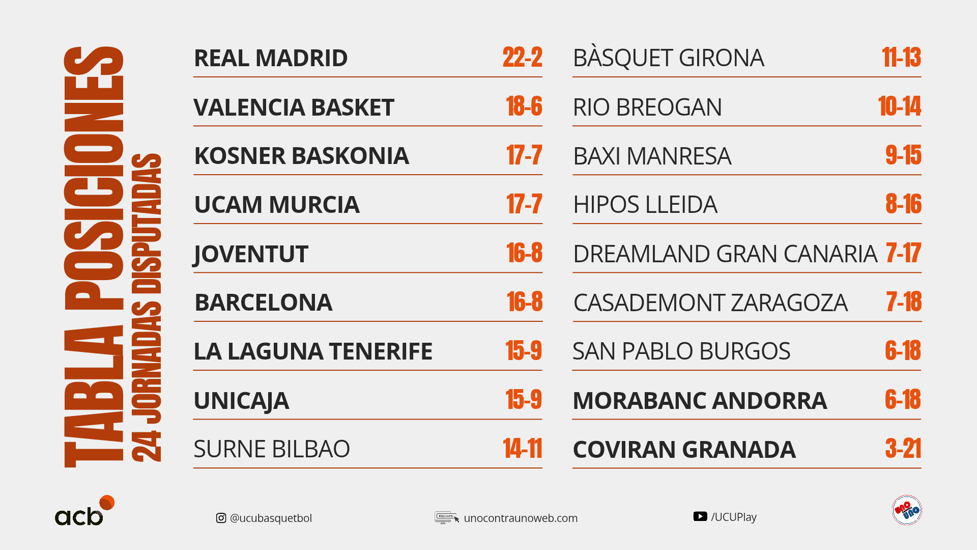 • Historial del cruce: El Asis Joventut lidera el historial con contundencia por 37-13. Sin embargo las últimas dos victorias le corresponden al UCAM Murcia, incluyendo la de la Jornada 10 por 80-77.